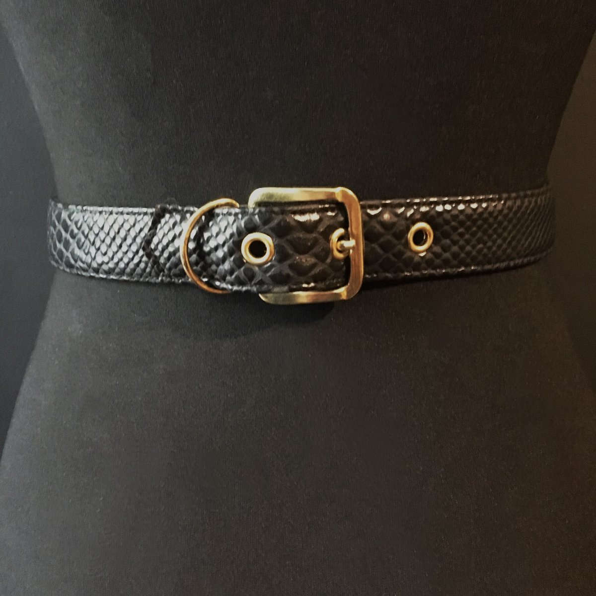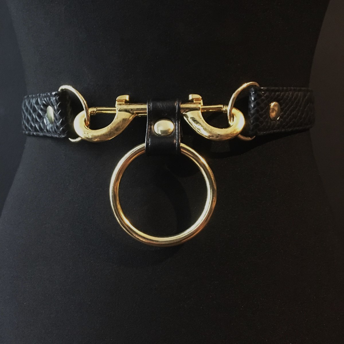 This belt is constructed in black vegan snakeskin and brass hardware. It features a double ended clip which is attached to a thick o ring with a vegan leather tab and secured with a rivet. This is then joined to a d ring on each side which is attached to the rest of the belt. It opens with a buckle and eyelets at the back.
